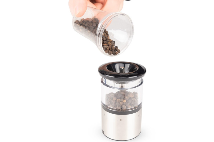 Il est accompagné d’une fiole épices remplie de poivre qui, une fois vide, vous servira de doseur et d’entonnoir pour simplifier le remplissage de votre moulin.