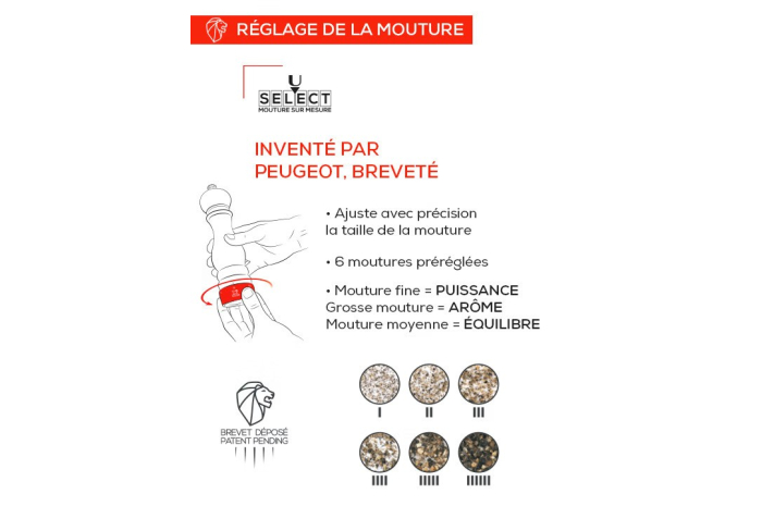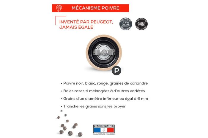 Pratique avec ses 6 crans de réglage situés sur la base du moulin, vous pourrez choisir en toute simplicité votre finesse de mouture préférée. Comme tous les moulins Peugeot, son mécanisme à poivre est garanti sans limitation de durée.