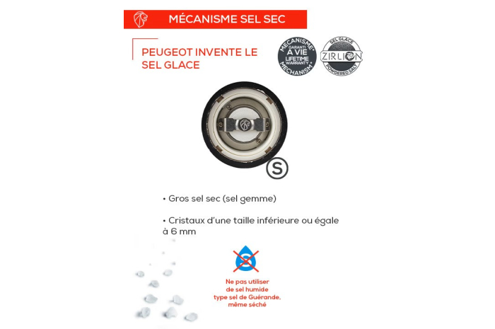 Ce moulin à sel a été fabriqué dans une pièce de hêtre issue de forêts françaises gérées durablement. Il permet de moudre des cristaux de sel secs et d'ajuster la mouture avec précision, grâce au système u’Select. Son mécanisme en Zircone, innovation de la Recherche et Développement Peugeot permet de délivrer du Sel Glace, d'une finesse extrême, offrant ainsi le plaisir gustatif du sel en limitant la quantité utilisée. Son système de réglage de mouture u'select, également exclusif à Peugeot, offre 6 positions de réglage pour ajuster au mieux la finesse de la mouture de votre sel sec, du sel glace au sel croquant. Mécanisme ZIRLION, garanti sans limitation de durée. Il permet de jouer sur l'intensité du craquant du sel. L'association du bois aux courbes et contre-courbes légendaires de la gamme Paris, confère une élégance intemporelle à ce moulin à sel. Sa taille de 15 cm se révèle être parfaite que ce soit pour un usage sur table ou en cuisine.