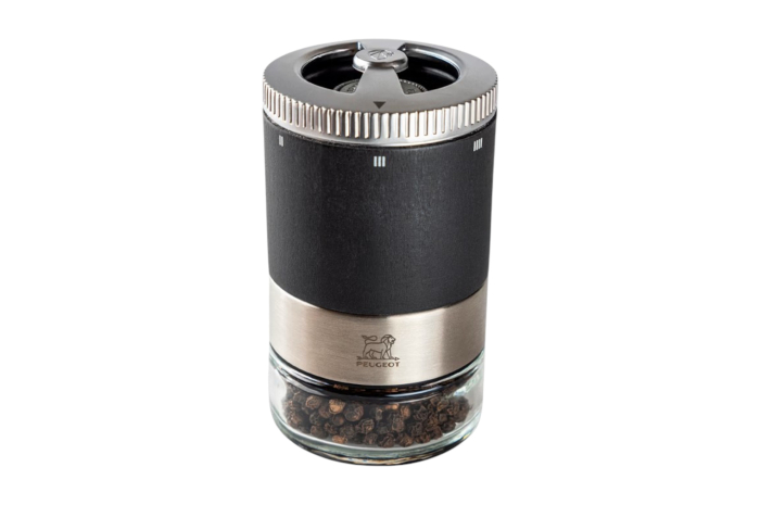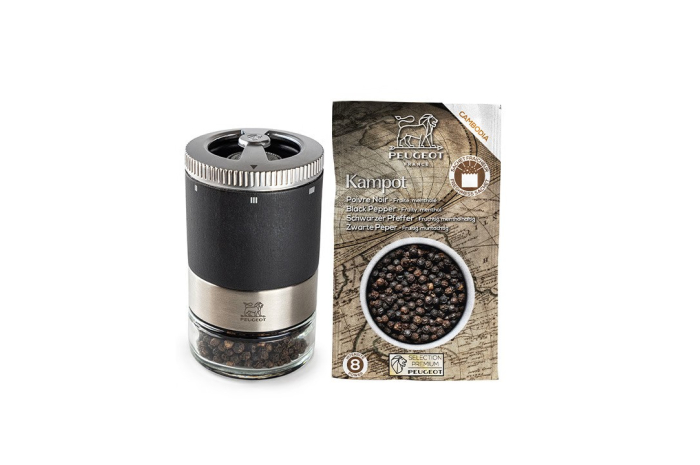 Pièce maitresse du Bar à poivres crée par Peugeot, le moulin Maestro se compose d’un corps en bois et d’un réservoir en verre, dévissable et facile à remplir. Equipé du système breveté u’Select, il facilite la sélection de la mouture, de la plus fine à la plus grosse. Il est accompagné d’un poivre noir de Kampot aux notes fruitées incomparables, dont les arômes sont préservés grâce dans un sachet fraîcheur.