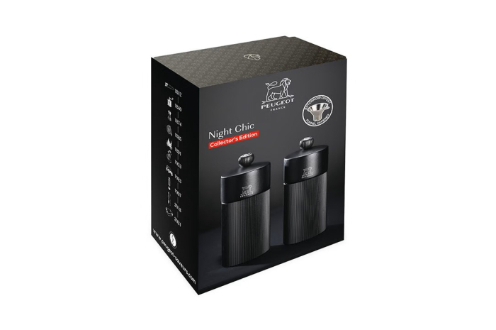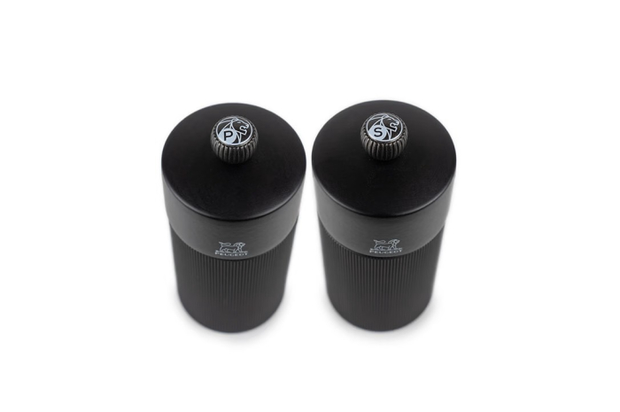 La collection Line séduit par son design envoutant en aluminium strié. Plébiscité pour son élégance rare et son ergonomie parfaite, le moulin Line se pare d’un magnifique habillage noir mat dans ce duo exclusif présenté en coffret cadeau. A la fois élégant et performant, ce duo s’accompagne d’un entonnoir en inox compact et pratique pour un remplissage facilité du poivre et du sel. Pour parfaire le tout, les deux moulins sont surmontés d’un bouton en métal noir particulièrement chic, marqué d’un P ou d’un S pour une identification en un clin d’œil de son contenu.