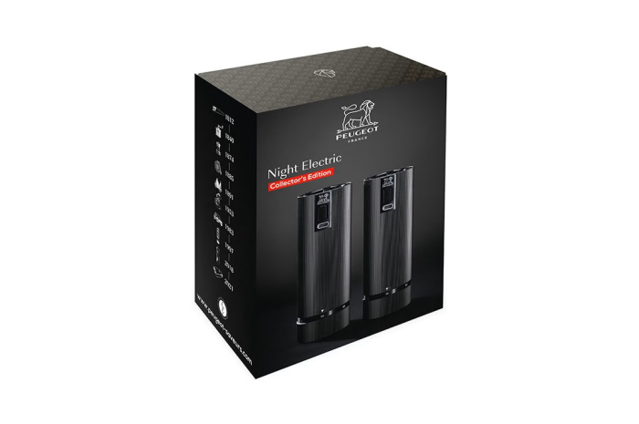 A inscrire dans votre wishlist ou à offrir à vos proches amateurs de design et de gastronomie, le coffret Night électrique fera l’unanimité. Avec ce duo de moulin à poivre et à sel électriques vous êtes sûrs de ne pas vous tromper. Ligne d’une élégance rare en aluminium strié habillé d’un noir mat particulièrement chic, le duo de moulins électriques Line noir mat est ingénieux du remplissage à la mise en marche. Tout est pensé dans le moindre détail : un design compact pour une prise en main optimale, une autonomie longue durée et un temps de charge rapide grâce à la batterie lithium ion dernière génération, un remplissage intuitif grâce à la forme en entonnoir du réservoir. Son mécanisme en Zircone, innovation de la Recherche et Développement Peugeot permet de délivrer du Sel Glace, d'une finesse extrême, offrant ainsi le plaisir gustatif du sel en limitant la quantité utilisée. Son système de réglage de mouture u'select, également exclusif à Peugeot, offre 6 positions de réglage pour ajuster au mieux la finesse de la mouture de votre sel sec, du sel glace au sel croquant. Mécanisme ZIRLION, garanti sans limitation de durée. A offrir sans modération et pour toutes les occasions.