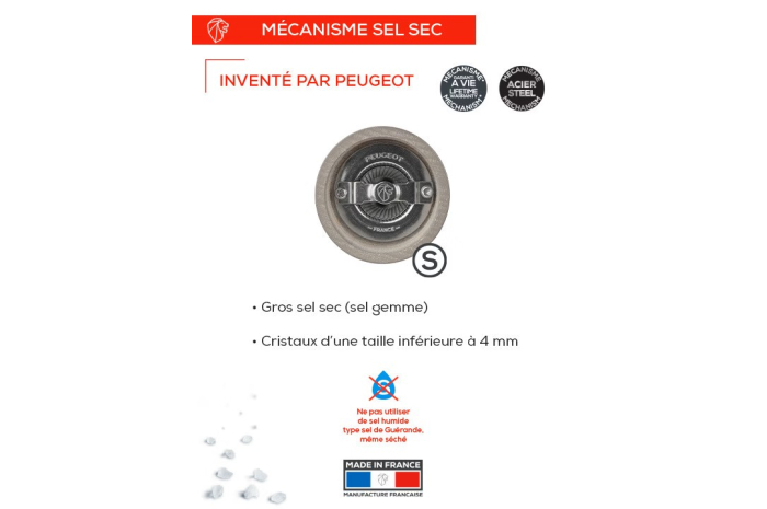 Le modèle bistro est le premier d'une grande lignée. Toujours fabriqué en France, il est équipé du mécanisme à sel Peugeot en acier, garanti sans limitation de durée. Ce modèle habillé d'une laque très chic est décliné pleins de couleurs pour créer des duos poivre et sel très remarqués.