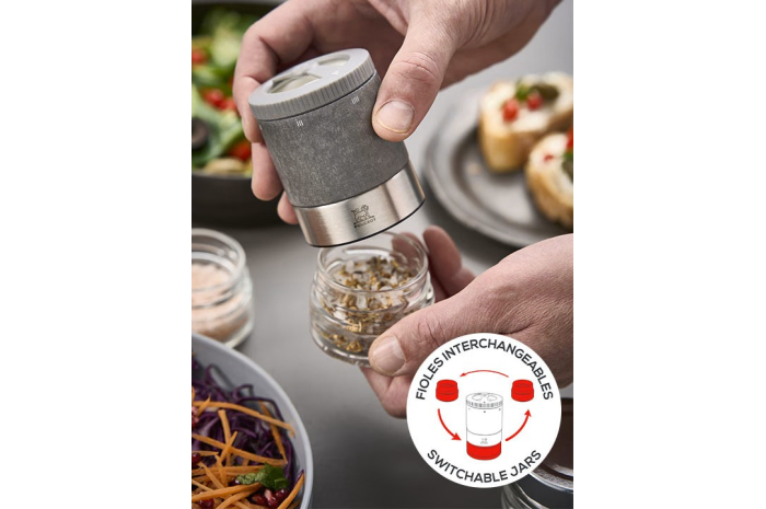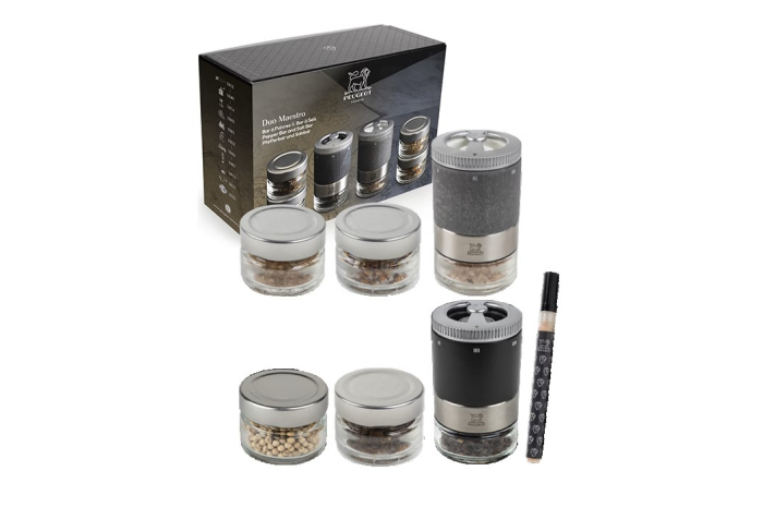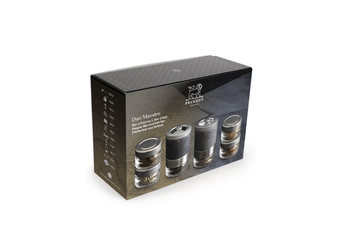 Pour ce duo inédit, Peugeot a réuni son bar à poivres et son bar à sels, deux moulins particulièrement ingénieux avec leurs réservoirs interchangeables qui permettent de passer d'un poivre à un autre ou d'un sel à un autre.