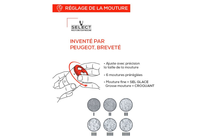 Equipé du nouveau mécanisme sel Peugeot, en zircone, matériau à la dureté exceptionnelle, Maestro sel permet d'obtenir du Sel Glace, une mouture d'une finesse extrême, et de profiter de tous les plaisirs du sel en en limitant la quantité et les méfaits.