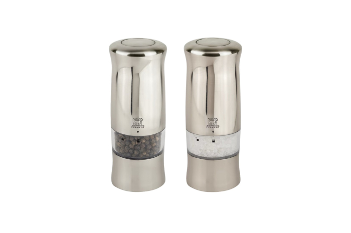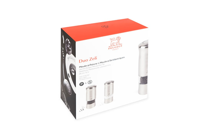 Présenté dans un coffret aux couleurs Peugeot, le duo de moulins électriques à poivre et à sel Zeli se distingue par son habillage façon métal brossé très contemporain.