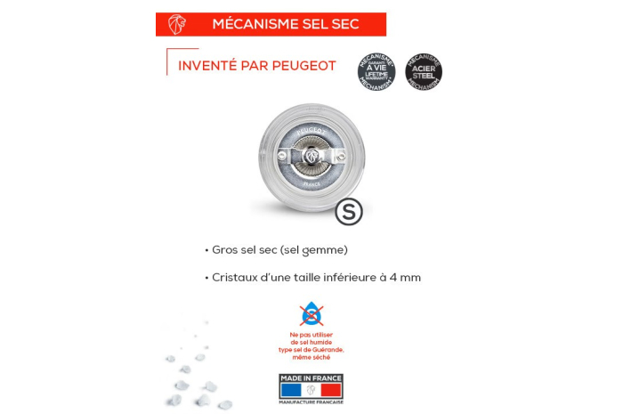 - Réglage de mouture u’Select : 6 tailles de moutures prédéfinies du Sel Glace au sel croquant