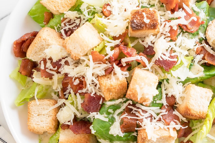 - Dans une assiette, disposez la salade, et versez la vinaigrette à la moutarde en son centre, sans mélanger. Réchauffez juste avant de servir les filets de poulet et les croutons en les repassant rapidement à la poêle quelques instants. Disposez les filets en couronne au dessus de la salade. Ajoutez les tomates cerises, les noix de cajou concassée et le parmesan débité.