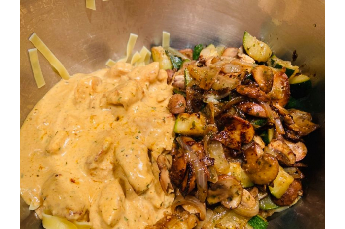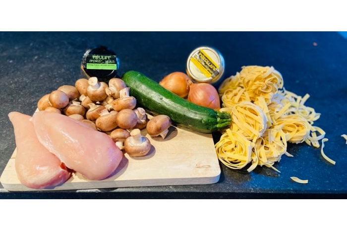 Pâtes courgettes-champignons-poulet