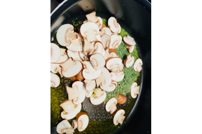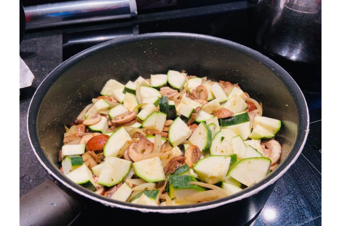 - Coupez vos champignons en lamelles, laissez cuire 5 à 6 minutes avec un bon filet d’huile, ajoutez les oignons, laissez 3-4 minutes, ensuite ajoutez votre courgette coupée en gros dés, les épices à Persillade et laissez mijoter 4-5 minutes.