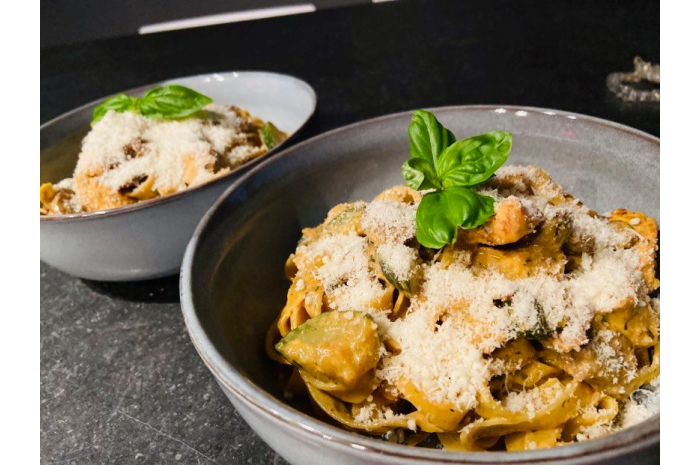 PÂTES AU POULET GRILLE, COURGETTE , CHAMPIGNONS ET PERSILLADE